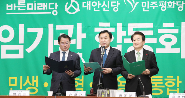 24일 오전 서울 여의도 국회에서 열린 바른미래당-대안신당-민주평화당 합당을 위한 수임기관 합동회의에서 바른미래당 손학규 대표가 합당 합의문을 낭독하고 있다. 왼쪽부터 대안신당 최경환 대표, 바른미래당 손 대표, 민주평화당 정동영 대표.