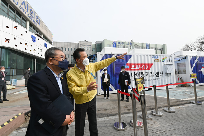 이항진 경기 여주시장이 지난 15일 시를 방문한 이재정 경기도교육감과 코로나19 대비 '안전한 학교만들기'를 위한 협력 방안에 대해 논의했다. 이날 이 시장과 이 교육감은 나이팅게일센터를 함께 둘러보고, '신속PCR 검사'로 지속적 교육활동이 가능하도록 해 교육 불평등 해소 및 부모돌봄 부담 완화를 위한 다양한 계획을 논의했다. 사진은 이 시장과 이 교육감이 나이팅게일센터를 둘러보는 모습. (사진제공=여주시청)