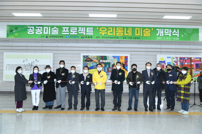 경기 구리시는 지난 3일 갈매역 지하보도에서 ‘2020년 공공미술 프로젝트 <우리동네 미술>’ 사업을 마무리하고 개막식을 했다. 김경윤 대표작가 등 34명이 참여했으며 갈매역 지하보도 등 4곳에서 앞으로 3년간 운영된다. 사진은 개막식에서 안승남 시장(가운데)과 관계자들이 테이프 커팅을 하는 모습. (사진제공=구리시청)