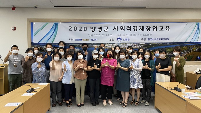 경기 양평군이 28일부터 사회적경제에 대한 인식개선 및 역량있는 사회적경제 기업가 양성을 위한 ‘2020년 양평군 사회적경제 창업교육’을 개강했다. 이번 교육은 오는 9월10일까지 기본, 심화, 창업컨설팅 등의 과정으로 진행된다. 사진은 개강식에서 관계자들이 기념촬영을 하는 모습. (사진제공=양평군청)