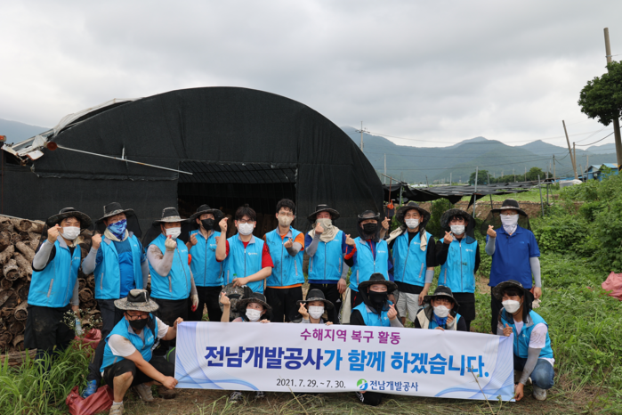 전남개발공사 임직원으로 구성된 나눔이 봉사단이 기록적인 폭우로 수해를 입은 농가를 돕기 위해 일사일촌 자매결연 마을인 장흥군 평촌마을을 찾아 수해복구 봉사활동을 실시했다고 밝혔다.