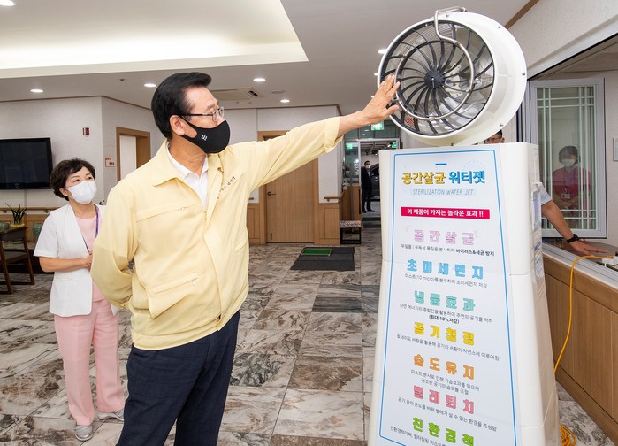 성장현 용산구청장이 10일 효창동 구립용산노인전문요양원을 찾아 전신 소독기·비대면 면회실 등 코로나19 방역 대응 시설물을 점검하고 이용자 편의시설(주차장) 개선 공사현장 등을 둘러봤다. 사진은 구립용산노인전문요양원을 찾은 성 구청장(오른쪽)이 시설을 살펴보고 있는 모습. (사진제공=용산구청)