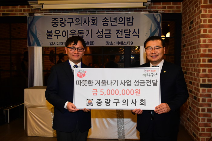 서울 중랑구는 지난 2일 중랑구의사회로부터 불우이웃돕기 성금 500만원을 전달받았다. 사진은 전달식에 참석한 류경기 구청장(오른쪽)이 중랑구의사회 회장과 기념촬영을 하는 모습. (사진제공=중랑구청)