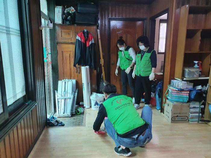 경기 의정부시 드림스타트는 최근 지역봉사단체 한우리 가족 봉사단3기와 함께 취약계층 아동 가구의 열악한 주거환경 개선을 위해 사랑의 집청소 봉사활동을 했다. 사진은 이날 봉사자들이 집안 청소를 하고 있는 모습. (사진제공=의정부시청)