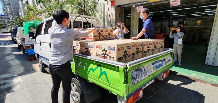 서울 도봉구 방학2동사랑나눔추진위원회와 도봉구사회복지협의회가 공동 주관해 추진하는 ‘한가득 사랑 나눔 프로젝트’를 이달부터 시작했다. 지역 주민 등이 십시일반 모은 나눔 물품을 추석 전 저소득 가구에 전달할 계획이다. 사진은 방학2동장(오른쪽)이 나눔참여 업체로부터 성품을 전달받고 있는 모습. (사진제공=도봉구청)
