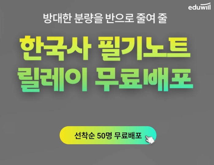 에듀윌 공무원은 9급공무원 한국사 전문 교수진의 필기노트를 매일 선착순 50명에게 무료로 제공하는 릴레이 무료 배포 이벤트를 준비했다.