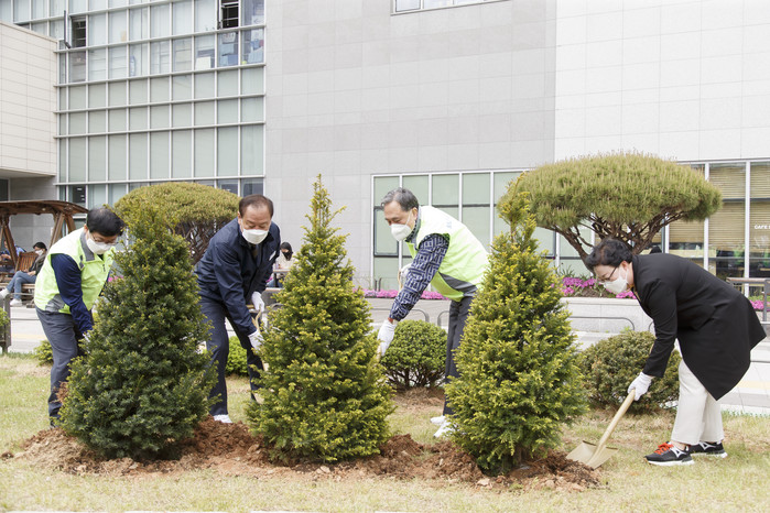 서울 마포구는 새마을금고중앙회와 지난 27일 마포중앙도서관에서 탄소중립 숲 조성 실현을 위한 '나무심기' 행사를 했다. 사진은 행사에서 유동균 구청장(왼쪽 두 번째)과 박차훈 새마을금고중앙회장(왼쪽 세 번째)이 나무를 심고 있는 모습. (사진제공=마포구청)