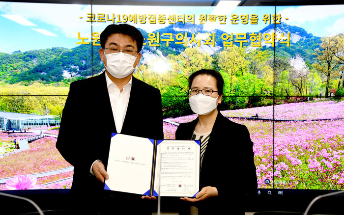 서울 노원구는 22일 노원구의사회와 코로나19 예방접종센터 의료지원 업무협약을 체결했다. 협약기간은 코로나19 예방접종 종료일까지며, 협약 내용은 코로나19 백신 예방접종 추진을 위한 민간의료인력 지원 등이다. 사진은 협약식에서 오승록 구청장(왼쪽)과 관계자가 기념촬영을 하고 있는 모습. (사진제공=노원구청)