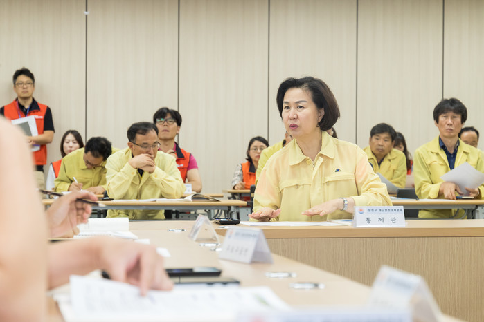 최근 김수영 서울 양천구청장이 구청 3층 재난안전대책상황실에서 태풍 ‘링링’ 북상에 따른 각 부서별 피해상황 및 대처상황을 점검했다. 점검결과 도로시설물 등 총 281건 피해상황이 접수되어, 240건 처리 완료했으며, 인명피해는 없었다. 사진은 각 부서로부터 보고를 받고 있는 김 구청장의 모습.(사진제공=양천구청)