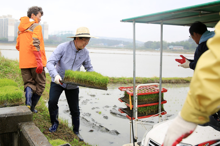 충남 서산시가 15일 대산읍 대로리 소재의 0.6ha 면적의 논에서 올해 풍년을 기원하는 모내기 시연회를 했다. 시연행사에서 맹정호 시장은 직접 이앙기를 이용해 모내기를 하고 현장에서 농업인들과 식사를 하며 영농현장의 애로사항을 청취했다. 사진은 맹 시장이 모판을 옮기고 있는 모습. (사진제공=서산시청)