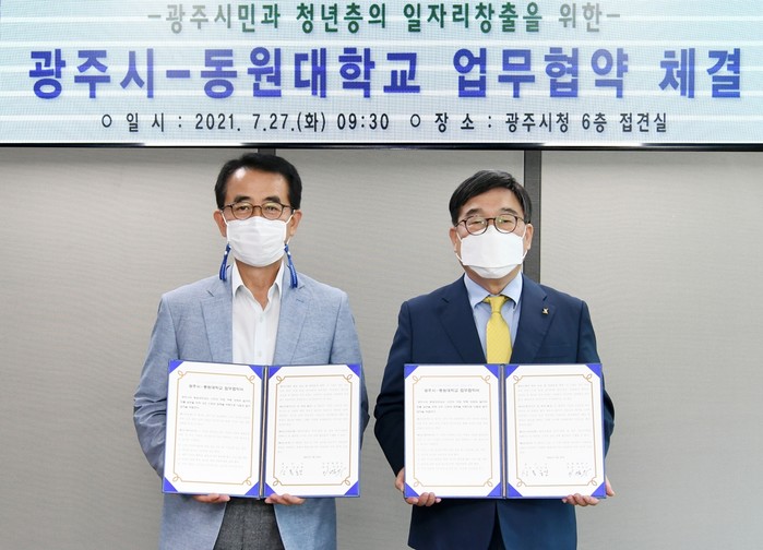 경기 광주시가 27일 동원대학교와 일자리창출 교류·협력 기반 구축을 위한 업무협약을 체결했다. 업무협약을 통해 지역산업과 시민들의 수요에 맞는 프로그램 개발, 맞춤형 인력 양성 등을 추진하기로 했다. 사진은 협약식에서 신동헌 시장(오른쪽)과 이걸우 총장이 기념촬영을 하는 모습. (사진제공=광주시청)