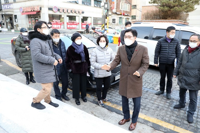 강동구가 명일역 2번 출구인근 먹자골목(명리단길)에 특화사업을 추진한다. 구는 거리 가꾸기 사업, 명리단길만의 특색있는 축제 발굴 등의 사업도 지속적으로 진행할 계획이다. 사진은 28일 명리단길 조성을 위해 이정훈 구청장(가운데)이 거리를 살펴보고 있는 모습. (사진제공=강동구청)