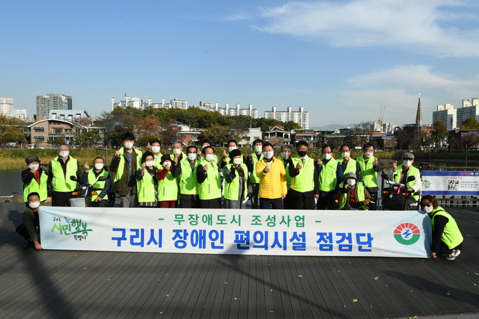 경기 구리시는 29일 장애인 편의시설 점검단과 함께 장애물 없는 생활환경 조성을 위해 불편사항을 점검했다. 이번 행사는 사전교육 후 구리시청 인근을 이동하며 단차와 볼라드로 인한 휠체어 진입 불가, 시각 장애인 등 보행자의 안전성 등 이동 불편사항을 중점으로 점검했다. 사진은 점검단이 이문안호수공원 일원을 현장 점검한 뒤 기념촬영을 하는 모습. (사진제공=구리시청)