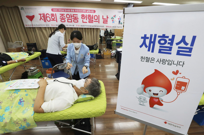 13일 오전 서울 성북구 종암동 주민센터에서 열린 '제6회 종암동 주민 헌혈의 날' 행사에서 주민들이 헌혈하고 있다. 코로나19 장기화로 혈액 수급난을 겪고 있는 가운데 주민이 자율적으로 기부한 헌혈증은 고려대 병원과 한국혈액암협회 등에 기증된다.