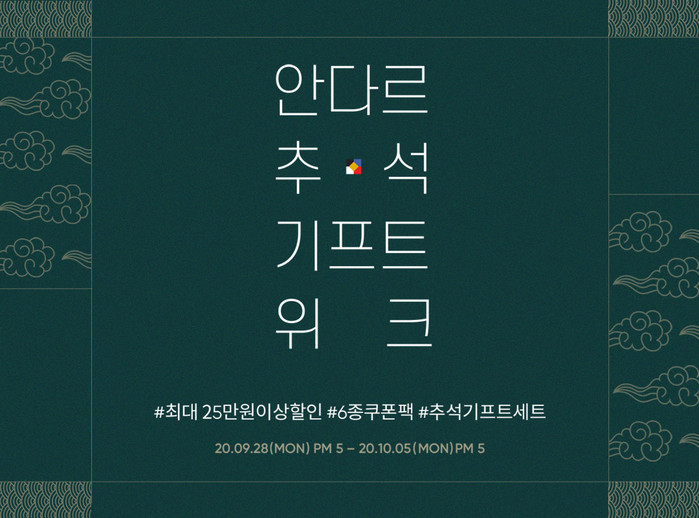 안다르 관계자는 “민족 대명절 추석을 앞두고 전 회원에게 6종 쿠폰팩 제공과 신규 기프트 세트를 출시해 안다르 제품을 보다 저렴하게 구매할 수 있는 프로모션을 마련했다”며 “장바구니에 담아두었던 상품이 있다면 안다르 기프트 위크를 놓치지 말길 바란다”고 말했다.