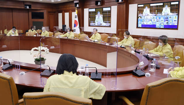 문재인 대통령이 13일 오후 정부서울청사에서 신종 코로나바이러스 감염증(코로나19) 대응 긴급 중앙재난안전대책본부(중대본) 회의를 주재하고 있다.