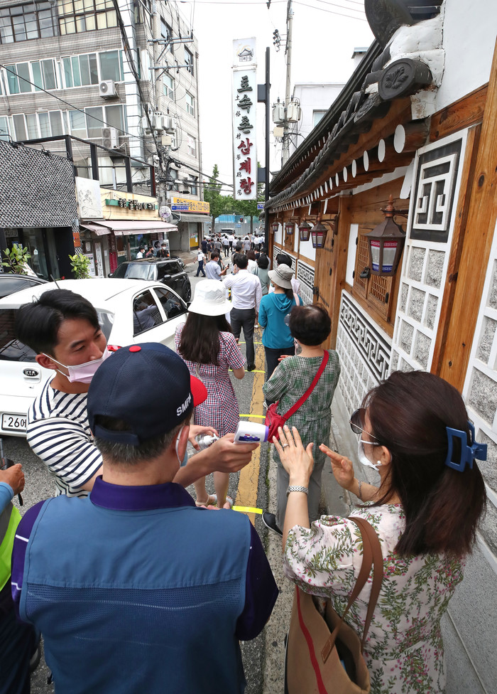 초복인 16일 서울 종로구의 한 삼계탕 전문점 앞에서 식당 관계자가 손님들의 체온을 재고 있다.