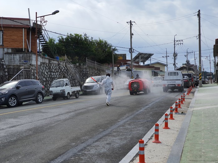 읍사무소에서는 국내 코로나19 확진자의 지속적 발생으로 지역사회 감염 확산을 막기 위한 대응에 총력을 기울이고 있으며, 코로나바이러스의 전파 차단을 위해 읍 관내 도로변 및 골목길 일대에 소독제를 살포한다.