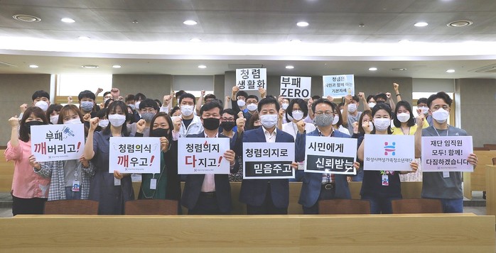 경기 화성시여성가족청소년재단이 3일 모두누림센터에서 ‘깨다’라는 타이틀로 ‘2020 부패제로(zero) 청렴 카드 섹션을 진행했다. 사진은 부패 깨버리고!’, ‘청렴 의식 깨우고!’, ‘청렴 의지 다지고!’ 등의 문구가 적힌 종이를 들고 포즈를 취하고 있는 재단 임직원들의 모습. (사진제공=화성시여성가족청소년재단)