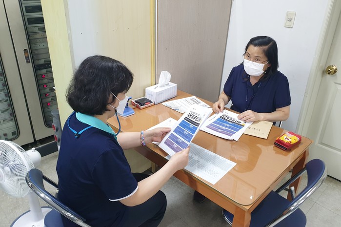 경기 수원시 장안구 정자3동은 지난 13일 지역내 아파트 21곳을 돌며 사회적 거리두기 4단계 격상에 따른 계도 및 홍보 활동을 전개했다. 사진은 동 관계자가 아파트 관리사무소를 방문해 사회적 거리두기 4단계 격상에 따른 홍보물을 전달하는 모습. (사진제공=장안구청)