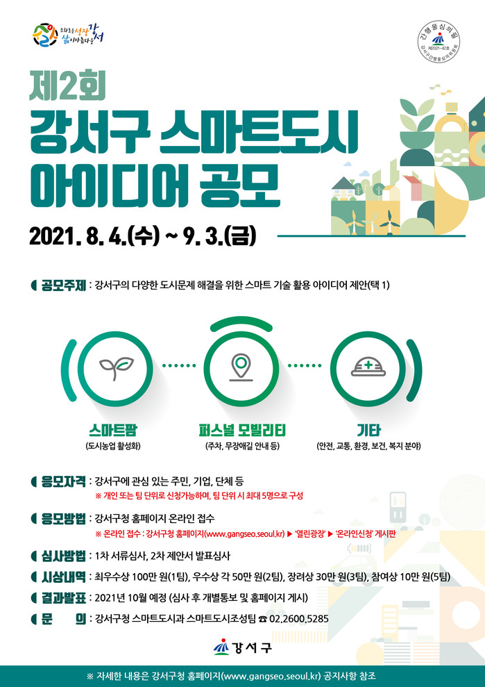 [시민일보 = 홍덕표 기자] 강서구(구청장 노현송)가 4일부터 오는 9월3일까지 '제2회 강서구 스마트도시 아이디어 공모전'을 개최한다.