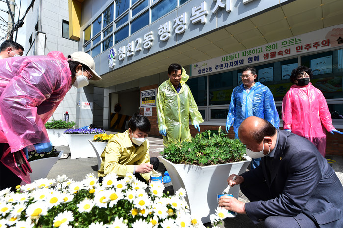 인천 부평구 청천2동 주민자치회는 21일 주민센터 앞 주차금지 의미로 설치돼 있던 낡고 지저분했던 화분을 함께 꾸미며 새롭게 단장했다. 사진은 차준택 구청장(왼쪽 두 번째)이 화분 꾸미기에 동참하며 함께 페인트칠을 하고 있는 모습. (사진제공=부평구청)