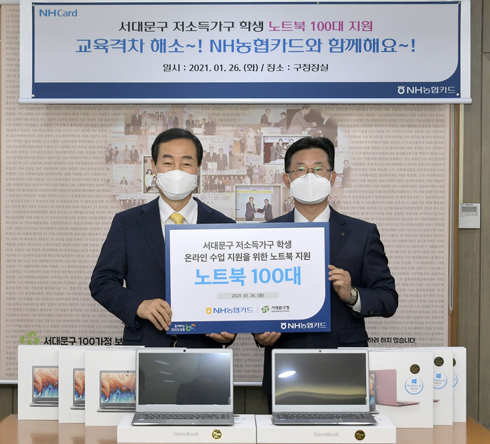 서대문구는 최근 NH농협카드로부터 비대면 수업에 따른 교육격차 개선을 위한 노트북 100대를 기증받았다. 구는 이 노트북을 개학을 앞둔 지역내 저소득 가구의 학생들에게 배부한다. 사진은 전달식에 참여한 문석진 구청장(왼쪽)과 서준호 부사장이 기념촬영을 하는 모습. (사진제공=서대문구청)
