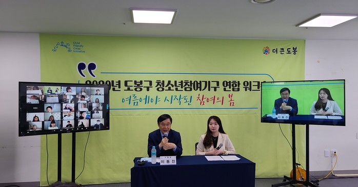 서울 도봉구가 최근 2020년 도봉구 청소년 참여기구 연합 워크숍을 개최했다. 이번 워크숍은 코로나19로 최소한의 인원만 참가하고, 비대면 온라인 방식으로 진행됐다. 사진은 이동진 구청장(왼쪽)이 코로나19로 힘든 청소년들에게 격려의 말을 하는 모습. (사진제공=도봉구청)