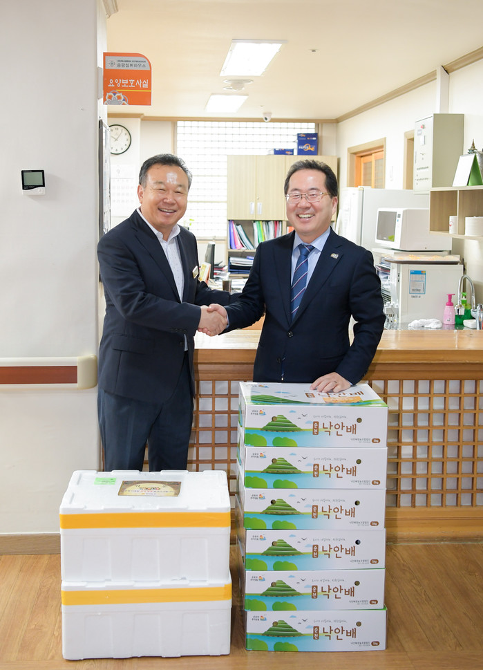 허석 전남 순천시장은 4일 추석을 앞두고 송광실버하우스를 비롯한 지역내 3개 노인요양시설을 방문해 위문활동을 했다. 이날 허 시장은 과일·소고기 등의 위문품을 노인들에게 직접 전달했다. 사진은 허 시장(오른쪽)이 시설 관계자와 기념촬영을 하는 모습. (사진제공=순천시청)