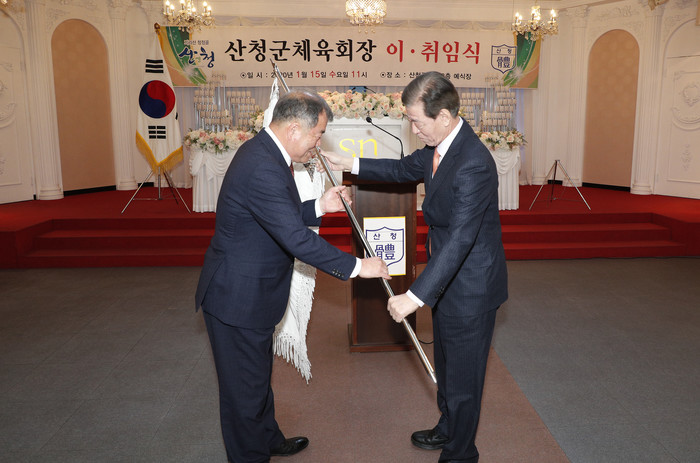 이날 취임식에는 이임 회장인 이재근 산청군수와 이만규 산청군의회 의장을 비롯해 지역 사회기관단체장과 체육회 관계자 등 150여명이 참석했다.