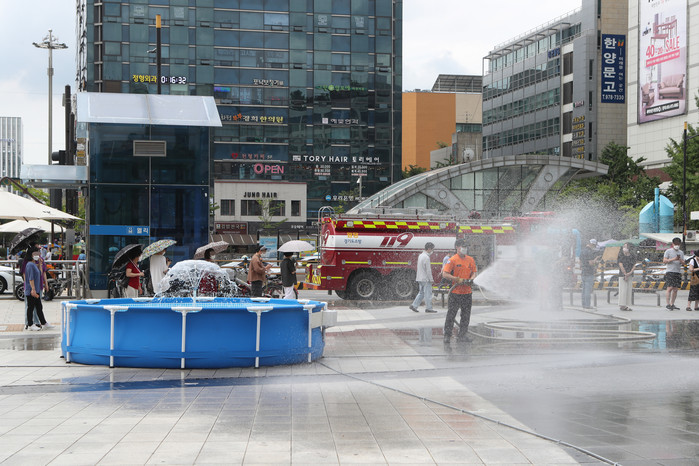 19일 경기 고양시 화정역 광장 선별진료소에서 소방관이 폭염 열기를 식히기 위해 물을 뿌리고 있다.