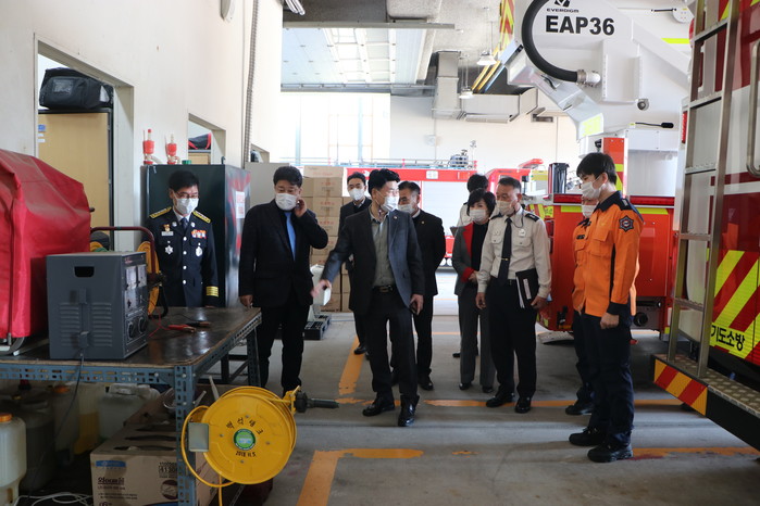 경기 양주소방서가 12일 경기도의회 안전행정위원회로부터 '2020년 행정사무감사'를 받았다. 감사는 위원장의 감사 개시 선언, 증인선서, 2020년 업무현황보고, 질의(위원) 및 답변(소방서장), 감사결과 강평 및 감사종료 선언 순으로 진행됐다. 사진은 감사반이 소방서 시설을 점검하고 있는 모습. (사진제공=양주소방서)