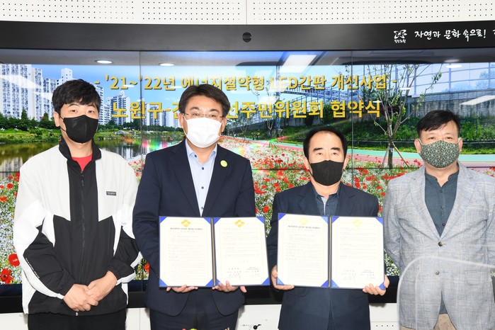 노원구는 6일 ‘노원구-간판개선주민위원회’ 협약식을 열었다. 이 협약식은 공릉역 일대 1.58km·177개 업소에 대해 2021~2022년 에너지 절약형 LED간판 개선사업의 원활한 추진을 위해 진행됐다. 사진은 협약식에서 오승록 구청장(왼쪽에서 두 번째)이 관계자들과 기념촬영을 하는 모습. (사진제공=노원구청)