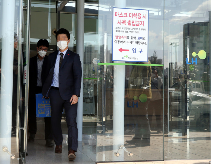 수도권 신도시 부동산 투기 의혹을 수사 중인 전북경찰청 반부패범죄수사대가 22일 한국토지주택공사(LH) 전북본부 사무실을 압수수색해 압수품이 담긴 박스를 옮기고 있다.
