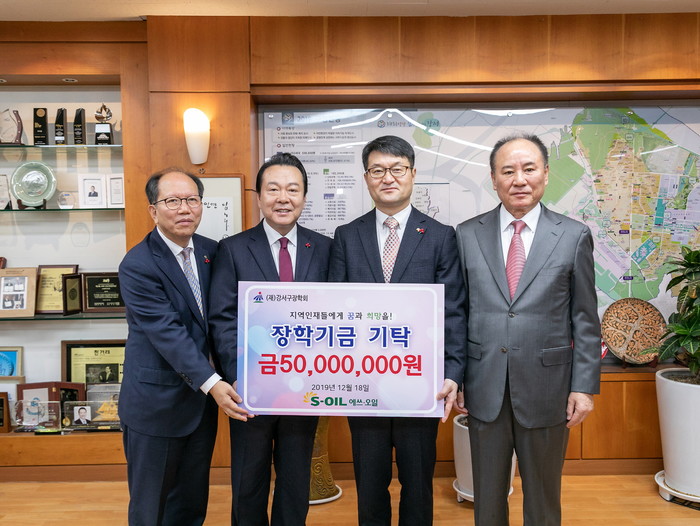 서울 강서구는 18일 구청장실에서 에쓰오일로부터 어려운 환경 속에서도 학업성적이 우수한 학생 등을 위한 5000만원의 장학기금을 기탁받았다. 사진은 노현송 구청장(왼쪽에서 두 번째)이 에쓰오일 관계자들과 기념촬영을 하는 모습. (사진제공=강서구청)