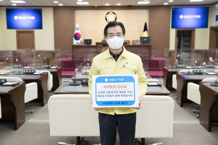 [시민일보 = 여영준 기자] 고기판 서울 영등포구의장이 지난 12일 영등포구의회 본회의장에서 ‘자치분권 기대해 챌린지’에 동참했다.