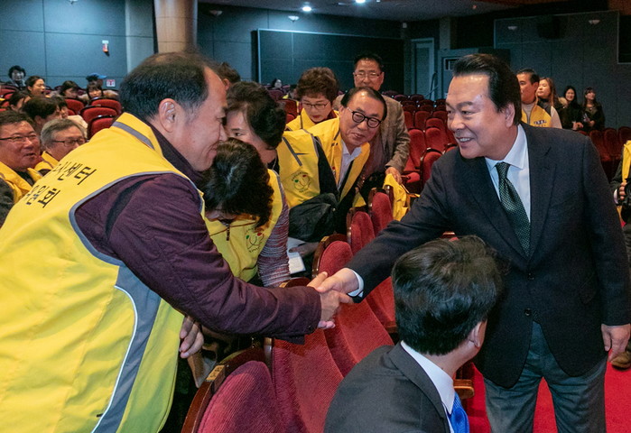 서울 강서구는 19일 강서구민회관에서 자원봉사자 500여명이 참석한 가운데 ‘자원봉사자 만남의 날 기념식’을 개최했다. 사진은 이날 기념식에 참석한 노현송 구청장(오른쪽)이 자원봉사자와 악수하며 격려의 말을 전하고 있는 모습. (사진제공=강서구청)