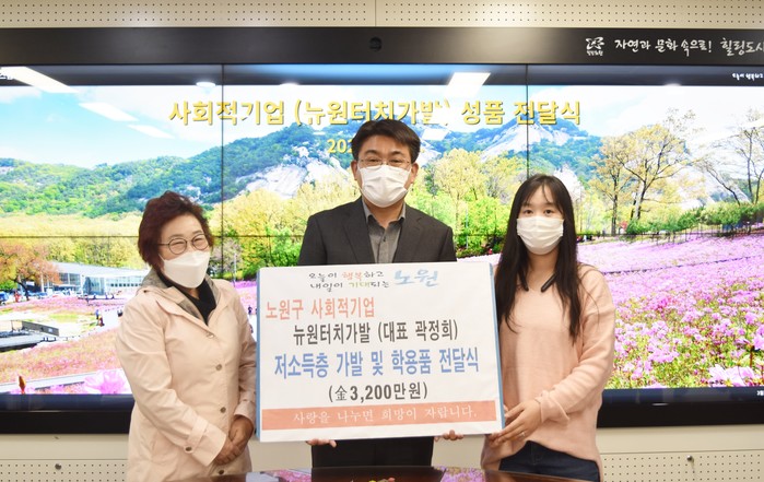 서울 노원구는 18일 예비사회적기업 뉴원터치가발로부터 가발 10개와 학용품 등 총 3200만원 상당의 성품을 전달받았다. 가발은 지역내 저소득층 암환자에게, 학용품은 저소득층 학생들에게 지원할 계획이다. 사진은 전달식에서 오승록 구청장(가운데)이 관계자들과 기념촬영을 하는 모습. (사진제공=노원구청)