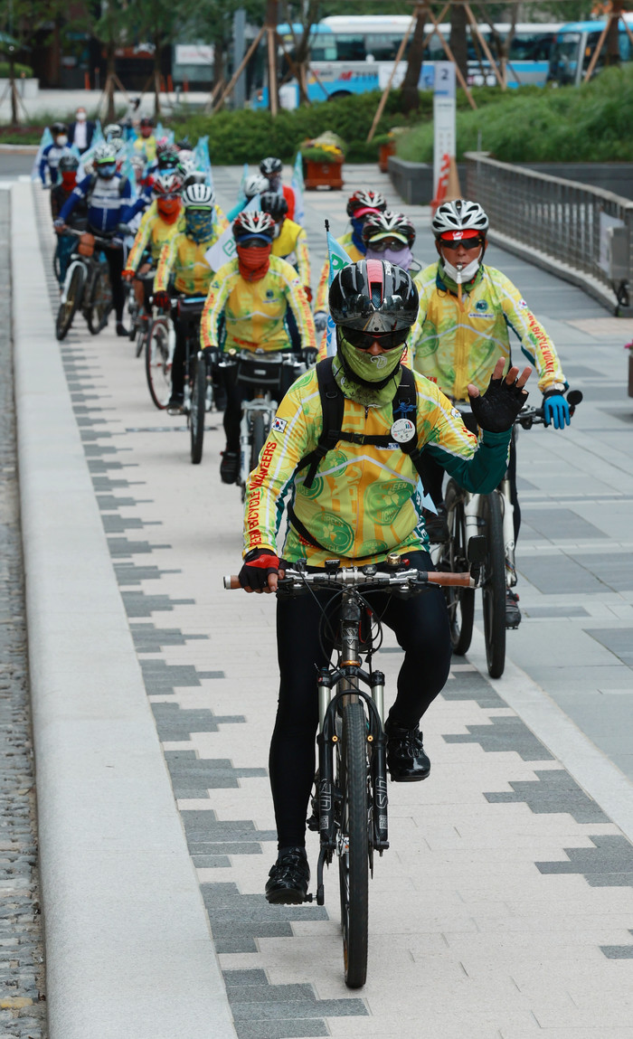한국자전거단체협의회 회원들이 UN 세계 자전거의 날을 맞아 3일 오전 서울 종로구 청계광장에서 자전거 전용도로를 따라 이동하며 탄소중립 실천 자전거 캠페인을 벌이고 있다.