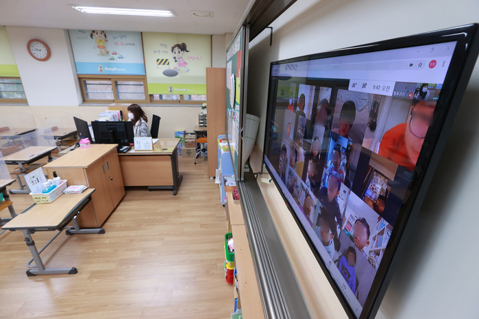 담임 교사가 학생들과 비대면 온라인 개학식을 하고 있다.
