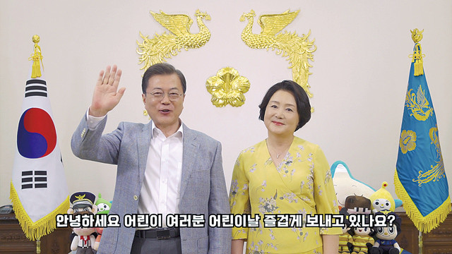 문재인 대통령과 김정숙 여사가 어린이날인 5일 가상공간 속에 마련된 청와대를 어린이들에게 소개하는 특별 영상에 등장해 인사하고 있다. 청와대가 제작해 유튜브에 공개한 이 영상은 온라인 교육을 받던 어린이가 가상공간에 구현된 청와대 내부로 ‘순간이동’을 해 대통령 부부를 만나 청와대를 여행하는 내용을 담고 있다.