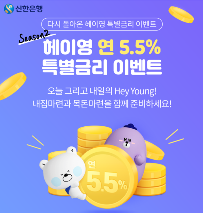 ‘Hey Young 특별금리 이벤트’는 주택청약종합저축을 가입하지 않은 Hey Young 고객(1991년 이후 출생고객)이 ‘신한 마이홈 적금’을 신규 가입하면 기존 최고 연2.2%에 이벤트 우대 이자율 연 3.3%를 추가해 최대 연 5.5% 특별금리를 적용한다. 기간은 3월 2일부터 6월 30일까지며 1인 1계좌 선착순 4만좌 한도로 제공한다.