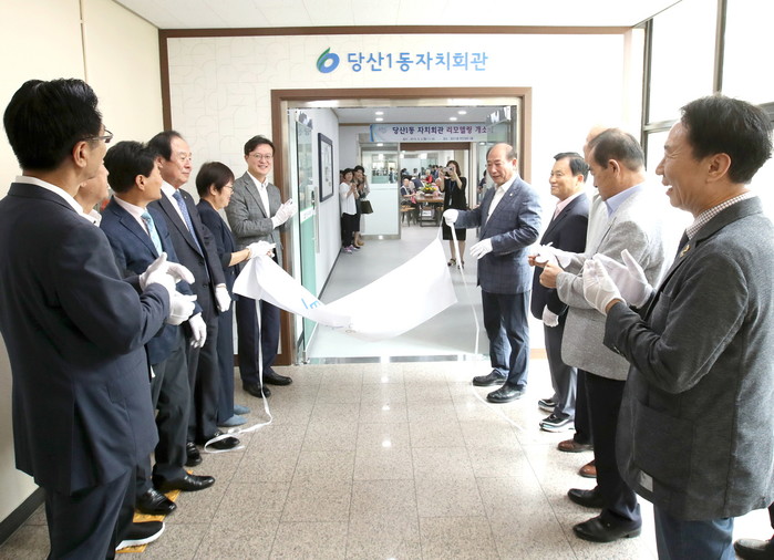 영등포구가 당산1동 주민센터 3층에 위치했던 정보화교육장을 강당, 프로그램실, 재능기부실 등으로 새 단장하고 2일 주민 100명이 참석한 가운데 개소식을 열었다. 사진은 채현일 구청장 등 관계자들이 개소를 축하하고 있는 모습. (사진제공=영등포구청)