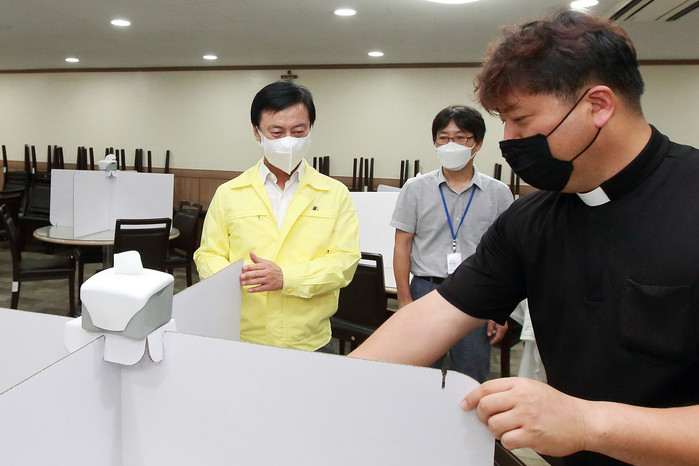 이강호 인천 남동구청장이 최근 11억원의 사업비를 들여 리모델링을 끝낸 남동장애인종합복지관을 방문해, 직접 현장을 방문해 관계자를 격려하고, 시설을 둘러봤다. 사진은 시설을 둘러보며 관계자의 설명을 듣고 있는 이 구청장(왼쪽)의 모습. (사진제공=인천 남동구청)