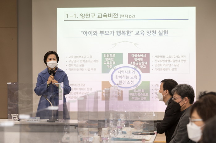 서울 양천구가 27일 지역내 19개 중학교 교장 및 강서양천교육지원청 관계자를 대상으로 ‘2021년 교육경비보조사업 설명회’를 개최했다. 사진은 설명회에 참석한 김수영 구청장이 교육경비보조사업에 대해 설명을 하는 모습. (사진제공=양천구청)