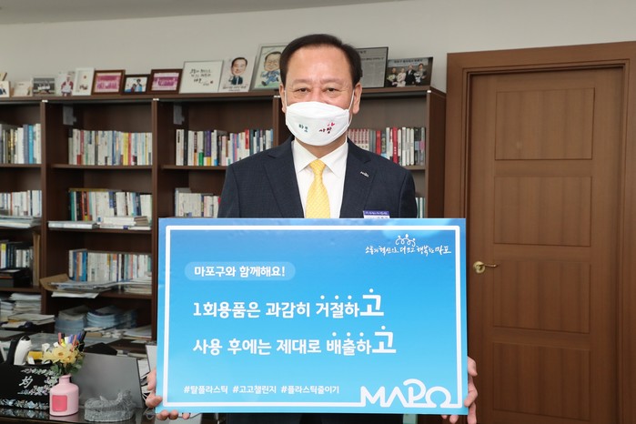 유동균 서울 마포구청장은 18일 플라스틱 줄이기 실천을 약속하는 탈(脫)플라스틱 실천 캠페인 ‘고고챌린지’에 동참했다. 사진은 유 구청장이 '고고챌린지'에 동참하고 있는 모습. (사진제공=마포구청)