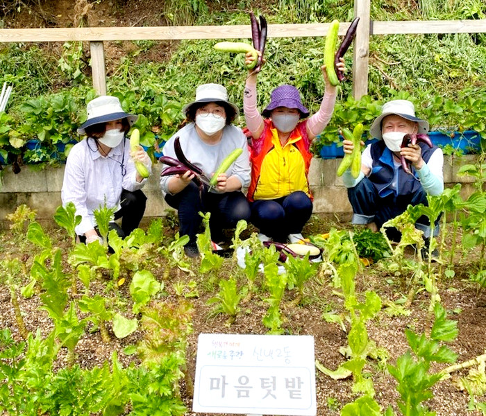 서울 중랑구 신내2동 주민센터는 최근 홀몸노인과 중장년 1인 가구에 분양한 신내동 중랑행복1농장 텃밭과 성자텃밭에서 수확한 상추를 수급자 등 어려운 이웃 50가구를 위해 전달했다. 사진은 중랑행복1농장에 마련된 신내2동 마음텃밭에서 1인 가구 주민들이 채소를 가꾸고 있는 모습. (사진제공=중랑구청)