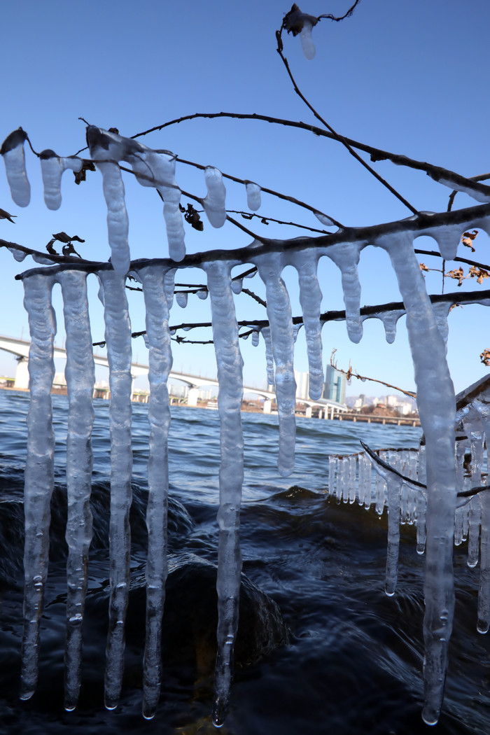 올겨울 첫 한파주의보가 발령된 14일 여의도 한강 주변에 고드름이 달려 있다. 이날 서울의 최저 기온은 영하 9.7도를 기록했다.