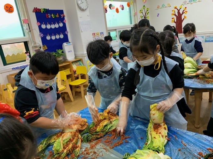 경기 양평군 강상 자연숲어린이집에서는 최근 학부모와 아이들이 함께 직접 김장김치를 담가 지역사회의 취약계층을 위해 김치 20통을 기부했다. 사진은 어린이집 어린이들이 김장을 하고 있는 모습. (사진제공=양평군청)