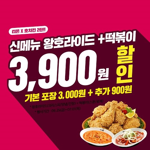 이번 프로모션은 지난 6월 출시한 치킨 크기를 상향시켰으며, 먹기 좋게 14조각으로 업그레이드를 한 왕호라이드, 로제떡볶이, 스푼떡볶이 결합 메뉴이다. 왕호라이드에는 크리스피, 양념, 간장이 있다.